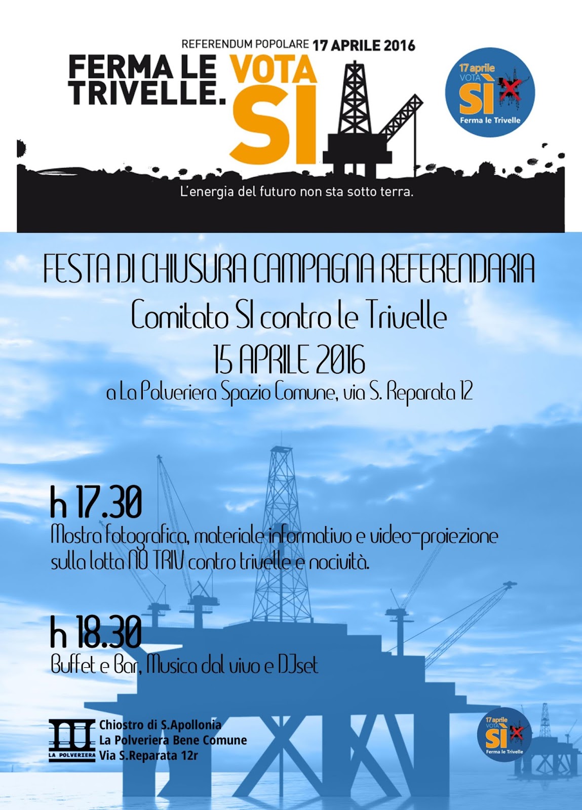 Venerdì 15 Aprile alla Polveriera ospiteremo la FESTA di chiusura della campagna referendaria organizzata insieme al COMITATO fiorentino SI CONTRO LE TRIVELLE.
