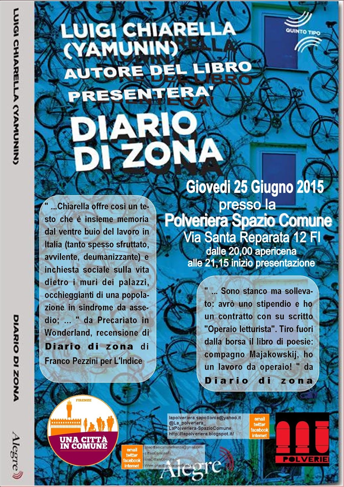Giovedì 25 Giugno la polveriera ospiterà la presentazione di DIARIO DI ZONA (edizioni Alegre) con l’autore Luigi Chiarella (in arte Yamunin).