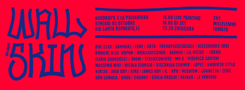 400 Drops e LaPolveriera SpazioComune presentano: WALL SKIN IS COMING, con tutti gli artisti che parteciperanno al prossimo WALL SKIN, riuniti per la preparazione delle opere che verranno esposte alla prossima Florence Tattoo Convention.